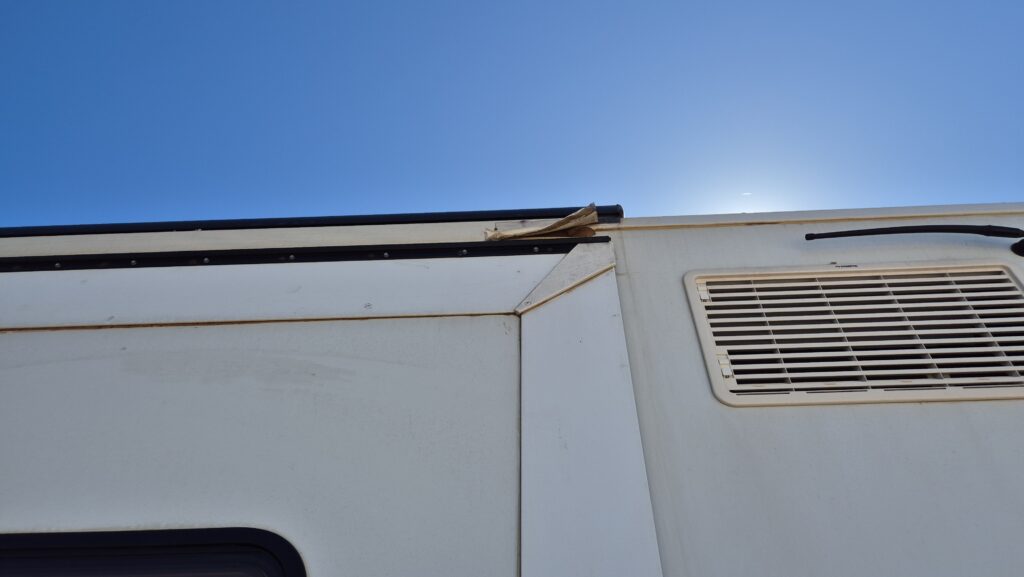Peeling at the top. The staff recorded the defects, and we were not charged for these damages when we returned the motorhome later.