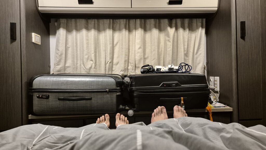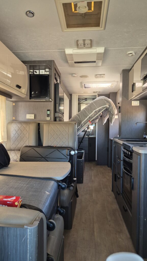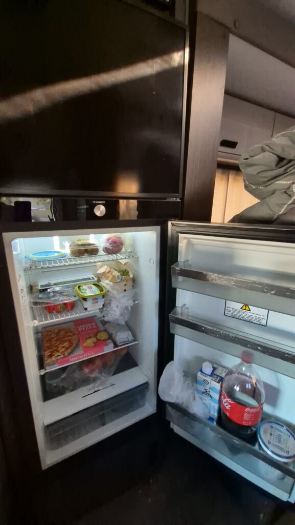 Our motorhome came with 4 berths, a dining table with chairs, a television, a fridge, air conditioning, a microwave oven, and a gas stove. It is also equipped with a toilet and a shower at the back. It has a total length of 27 feet.