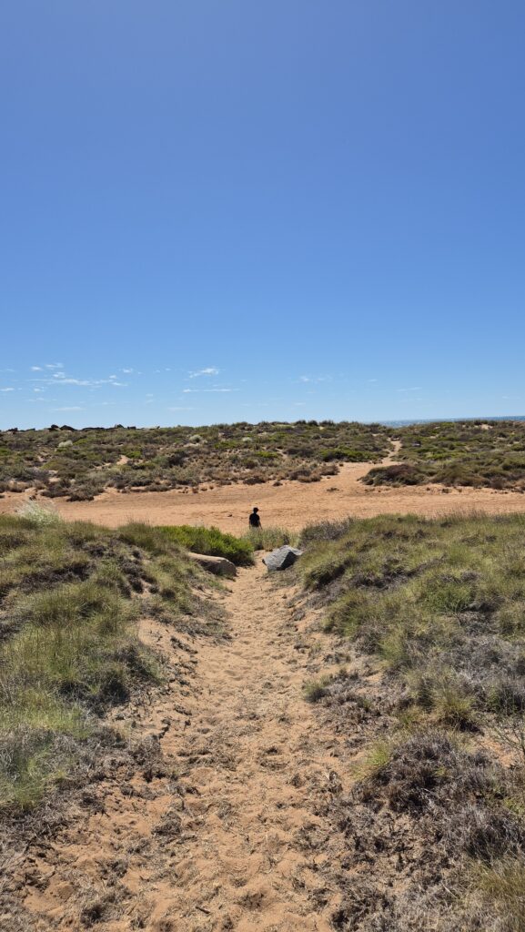 Through a sandy path.