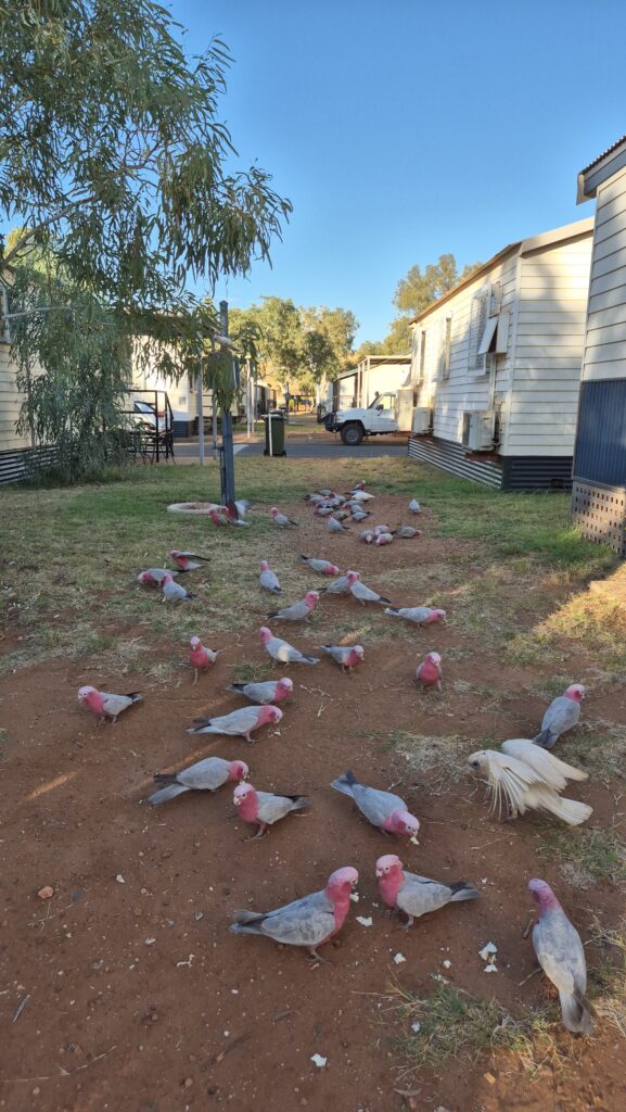 A flock of cockatoos was having dinner in front of us.